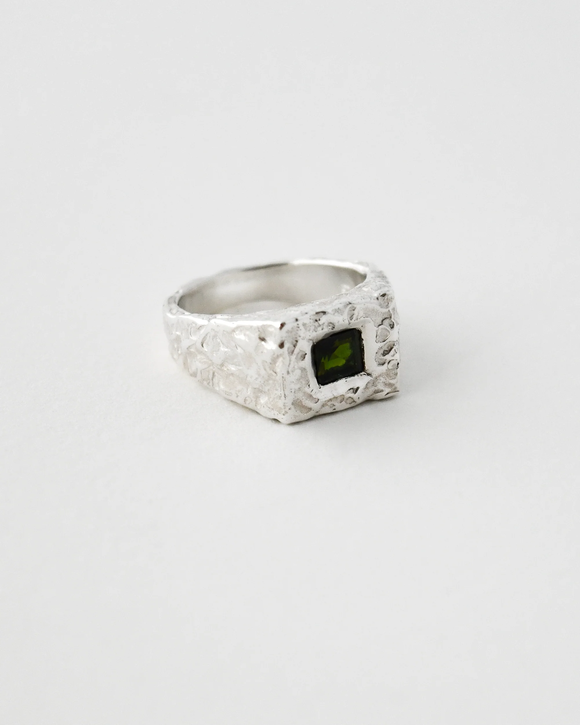 Limited edition Pumice Signet in Sterling Silver, featuring a Natural Green Tourmaline center stone.